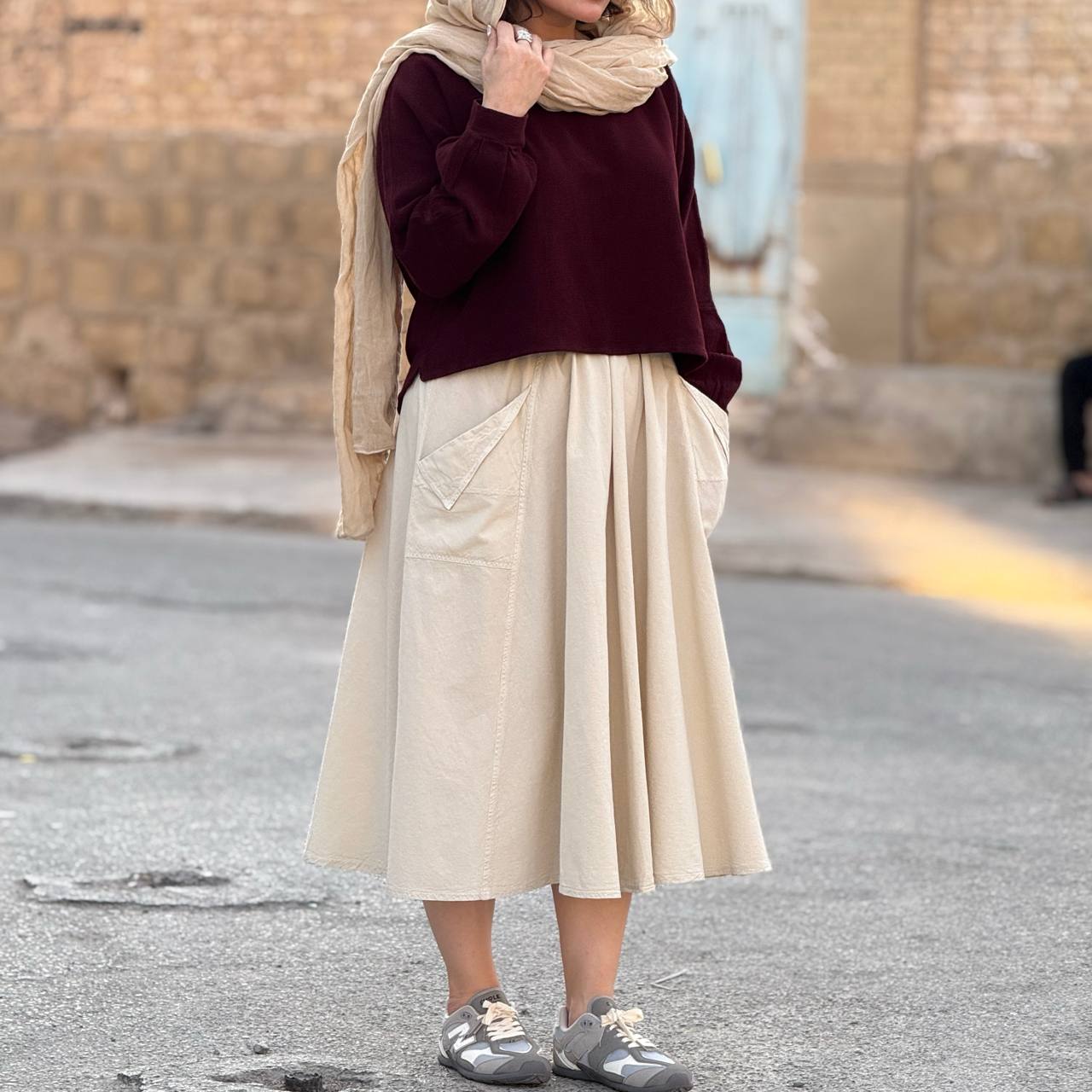 - دامن خاکی با کراپ زرشکی: ظاهری گرم و چشم نواز برای قرارهای خاص.