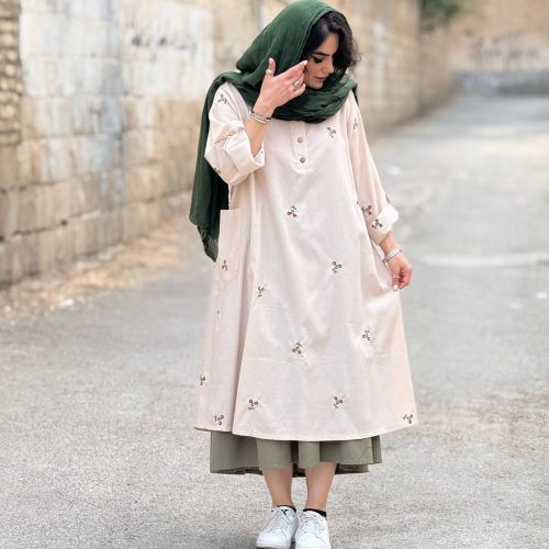 اگر اهل ستهای پاییزه جذاب هستید، این پیراهن لینن بارداری 1425 با دامنهای خوش رنگ پاییزی مثل آجری، نسکافهای، زیتونی و خردلی ترکیبی فوقالعاده میسازد. جنس لینن به دلیل بافت الیاف طبیعی و کرمش، با کتونیها، ونس، شالهای بافت و حتی کیفهای ساده به زیبایی ست میشود. به این معنی است که فقط یک لباس نمیخرید؛ بلکه یک پایه ثابت استایلهای پاییزه انتخاب میکنید که هر بار شکل تازهای قابل ست کردن است.